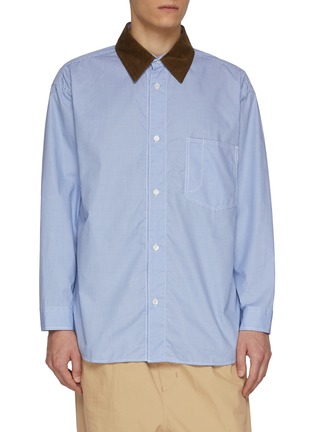 COMME des GARÇONS HOMME refines a timeless silhouette with tactile contrast. Crafted from fine cotton in a micro-check pattern, this shirt is distinguished by a rich corduroy collar that frames the face with subtle depth—an understated piece that elevates everyday tailoring.