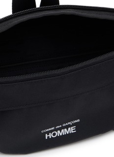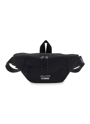 Comme des Garçons Homme presents a streamlined belt bag with minimalist logo branding and dual-zip main compartment for secure storage. The ergonomic silhouette with adjustable webbing strap and front zip pocket delivers hands-free convenience, while clean-lined construction and functional D-ring detail create a versatile essential for contemporary urban explorers.