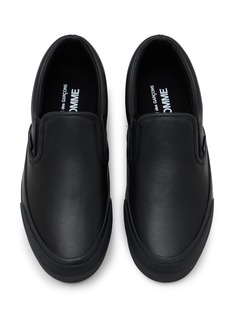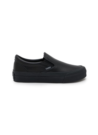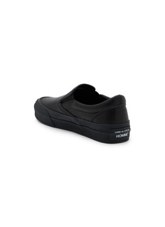 Comme des Garçons Homme reinterprets the classic slip-on sneaker with a monochromatic minimalist aesthetic and substantial platform sole. The streamlined laceless silhouette with tonal branding and exaggerated midsole delivers understated Japanese design sophistication, while the clean-lined construction and chunky proportions create versatile street-style appeal for contemporary wardrobes.