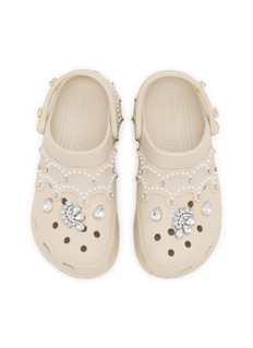 Crocs' embellished platform clogs feature ornate pearl and crystal detailing across the upper and platform base for glamorous appeal. The signature ventilated design with adjustable heel strap ensures breathable comfort, while the exaggerated chunky sole delivers bold elevation. A statement footwear piece that transforms classic clog styling into high-fashion territory.
