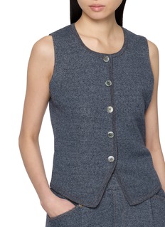 CRUSH Collection 以休闲质感诠释轻复古风格,这款背心用单排扣设计添利落细节,牛仔色调质感衬出松弛氛围,简约廓形适配叠穿。搭配同系列裤装,可演绎复古协调的成套造型。