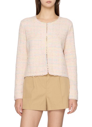 CRUSH Collection 擅于运用羊绒面料及针织技术,打造拥有简约舒适廓形的现代女性服饰。这款夹克以杂色粗花呢织出柔和肌理,圆领与钩边细节添法式精致,淡彩混织适配春夏,是日常通勤、休闲的温柔系单品。