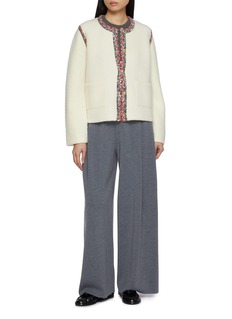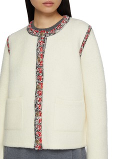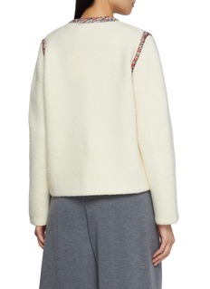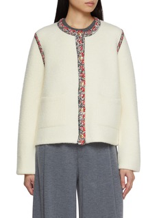 CRUSH Collection 擅于运用羊绒面料及针织技术,打造拥有简约舒适廓形的现代女性服饰。这款宽松剪裁的夹克采用意大利布克莱纱线精心编织,呈现轻盈蓬松的刷毛质感,触感柔软温暖。点缀斑驳粗花呢饰边,增添精致细节。