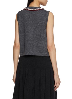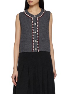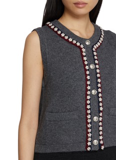 CRUSH Collection 擅于运用羊绒面料及针织技术,打造拥有简约舒适廓形的现代女性服饰。这款外套背心采用柔软的羊毛羊绒混纺面料编织而成,领口与门襟处饰有手工钩编饰边,并点缀着两种尺寸的仿珍珠。