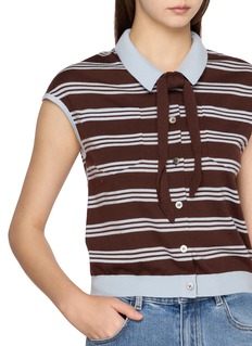 CRUSH Collection 擅于运用羊绒面料及针织技术,打造拥有简约舒适廓形的现代女性服饰。这款针织衬衫以棕白条纹织出复古质感,翻领 领结细节添轻甜氛围,无袖版型适配春夏。撞色包边提亮层次,单排扣设计利落实用,搭牛仔显松弛随性。