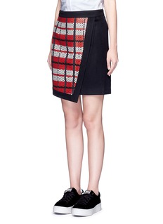 编织纹理是Cynthia & Xiao 2016秋冬的主打元素,这款半身裙以深蓝色混羊毛面料拼接红白黑拼色编织格纹面料,打造出夺目前卫的风格,结合叠搭式双层设计,增添层次魅力。精湛剪裁可突出优美的双腿,搭配品牌同款夹克即可展现干练帅气的都市形象。