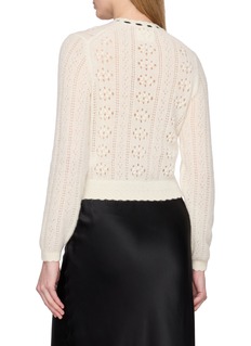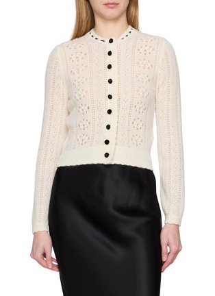 This Corsette cardigan by DÔEN marries Victorian romance with contemporary elegance in luxurious cream. The intricate pointelle knit creates delicate openwork patterns throughout, while contrasting buttons down the centre front add striking graphic detail. Crafted from soft, fuzzy yarn with a gently cropped silhouette, the fitted shape flatters the figure beautifully.