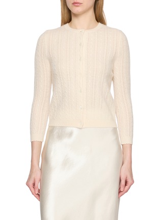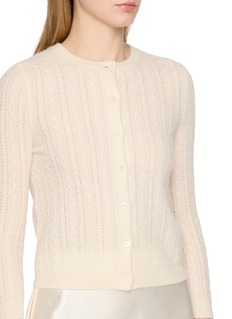 An ode to ‘90s minimalism, the Danae Cardigan by DÔEN refines the classic crewneck silhouette in whisper-light cashmere. Intricate cable-pointelle lines elongate the frame, while luminous mother-of-pearl buttons lend a delicate finish. Wear it buttoned with a satin skirt or layered over dresses for quiet sophistication.