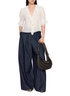 A signature silhouette revisited, the Henri Top by DÔEN is cut with an ethereal drape. Cascading eyelet-trimmed ruffles frame the plunging V-neckline, while clustered pintucks lend texture through the yoke and sleeves. Style loose with denim or tucked into tailored separates.