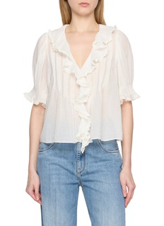 A signature silhouette revisited, the Henri Top by DÔEN is cut from whisper-light organic cotton voile with an ethereal drape. Cascading lace-trimmed ruffles frame the plunging V-neckline, while clustered pintucks lend texture through the yoke and sleeves. Style loose with denim or tucked into tailored separates.