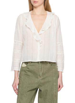 An ode to heirloom dressing, the Hugette top by DÔEN drapes in sheer voile with softly structured pintucks and lace insets tracing the sleeves. The cascading ruffled V neckline lends poetic movement. Style it with high-rise denim or fluid skirts for an effortless, sun-faded romance.