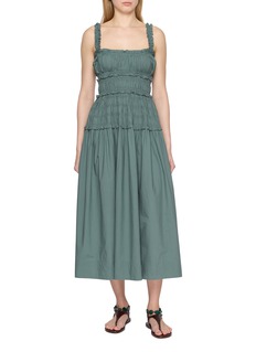 A portrait of quiet romance, the Marianne dress by DÔEN is shaped with intricate smocking through the bodice, creating a softly defined silhouette before falling into a fluid midi skirt. Ruffled straps and a square neckline frame the shoulders with delicate ease. Style with leather sandals for sun-drenched weekends or layer with a cardigan for city strolls.