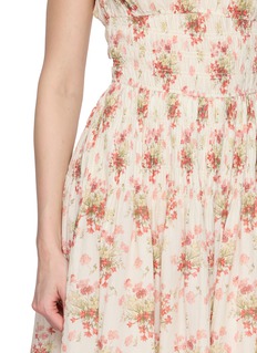 Sun-washed romance defines the Quinette Dress by DÔEN, cut from featherlight organic cotton voile scattered with Lantana blooms. A softly sculpted sweetheart neckline and cap sleeves frame the décolletage, while the shirred bodice and fixed smocked waist fall into a fluid midi skirt. Perfect for garden fêtes or barefoot holidays.