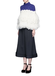 Delpozo这款上衣以套头无袖款式和夸张廓形表达出时尚个性,选用高品质混羊驼毛面料,带给您轻柔温暖的触感。上半身采用蓝色拼白色修身纹理针织设计,下半身拼接十分丰盈厚实的层次毛线流苏,打造出具有强烈对比效果的轮廓,展现您独具一格的摩登风范。