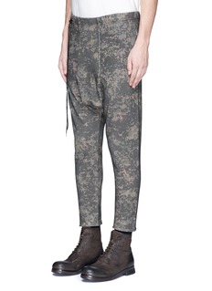 DEN IM by Siki Im这款休闲裤通身缀有深浅棕色拼绿色的数码印花,透出刚阳气息,七分长度及低裆设计塑造出独特廓形,配以侧向的抽绳裤腰,尽显品牌前卫不凡的格调。