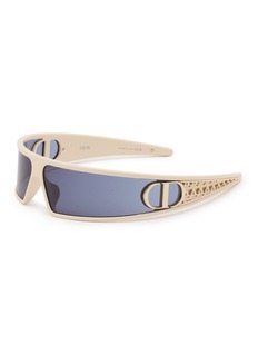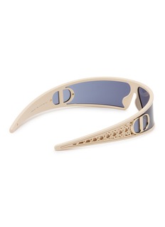 DIOR 这款 VeryDior M1U 眼罩式太阳眼镜彰显超现代美感。板材雕刻镜框彰显镜腿上的藤格纹图案、金属 CD 标志和蓝色曲面镜片,增添高订气质。可像发带一样戴在头上,打造前卫的造型。