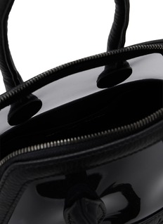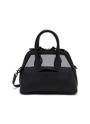 Discord Yohji Yamamoto's small structured bag merges architectural precision with transparent design innovation. The compact silhouette features dual top handles, transparent side panels contrasting with opaque construction, dual zip closures, detachable crossbody strap, and protective base studs. Contemporary edge meets utilitarian sophistication.