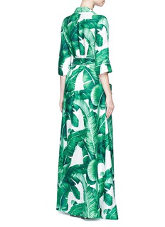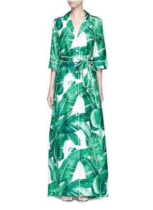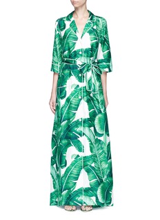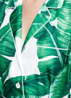 杜嘉班纳此款连衣裙以嫩绿的香蕉树叶印花引人注目,流畅的廓形借鉴了流行的睡衣,平驳领、七分袖的设计充满随性格调,附腰带的设计可突显身型曲线,打造清新优雅风格。