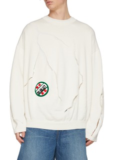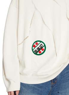 This doublet sweater is a masterful blend of comfort and avant-garde style, ideal for those who appreciate unique fashion statements. Crafted from a premium soft fabric, this piece offers a relaxed fit and a cozy feel, making it perfect for cooler days. The sweater is distinguished by its deliberately distressed details, featuring random tears that add an edgy, deconstructed aesthetic. The bold green and red patch on the front provides a pop of color and a playful twist, reminiscent of vintage sportswear logos.