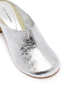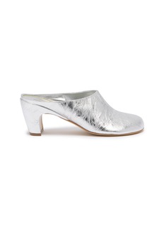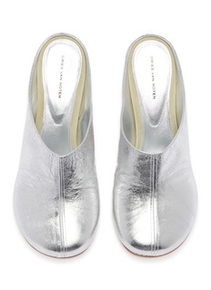 Dries Van Noten 呈现精致穆勒鞋,金属皱褶饰面与建筑感方跟交织出先锋极简美学。圆头中跟的套脚设计尽显从容优雅,光泽质感表面与利落线条构筑出当代高级着装的惊艳宣言。