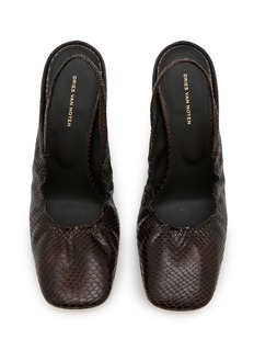Dries Van Noten 以繁复印花、奢华面料和精致剪裁著称,融合东西方元素,展现浪漫与优雅并存的独特美学。这款高跟鞋以纤细绕踝设计和蛇皮纹皮革剪裁勾勒张力,不规则高跟设计阐释微妙比例。