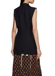 Dries Van Noten 以繁复印花、奢华面料和精致剪裁著称,融合东西方元素,展现浪漫与优雅并存的独特美学。这款马甲采用非对称设计系带轮廓,双色编绳灵动跳跃于身线,搭配加长半身裙助力你的都市华丽登场。