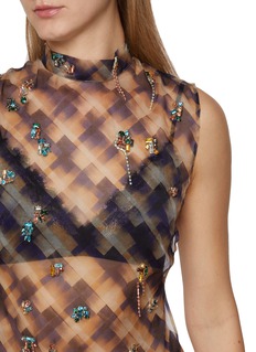 This bib-style top by Dries Van Noten merges sheer geometry with jewel-like accents. Cut in a sleeveless silhouette with a high collar, its translucent check base is adorned with multicolour strass embellishments. A daring layering piece, it adds radiance to tailored separates or evening skirts.