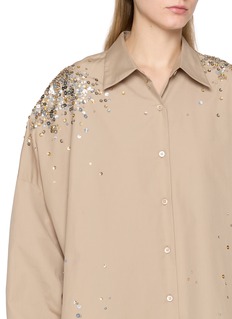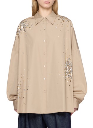 Dries Van Noten 以繁复印花、奢华面料和精致剪裁著称,融合东西方元素,展现浪漫与优雅并存的独特美学。这款衬衫以不规则亮片缀饰点亮宽松廓形,闪耀细节增添摩登气息。