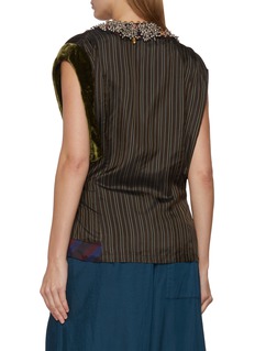 Dries Van Noten 以繁复印花、奢华面料和精致剪裁著称,融合东西方元素,展现浪漫与优雅并存的独特美学。这款上衣采用精美仿钻刺绣工艺,撞色拼接设计彰显品牌标志性的视觉冲击力,系带围裹设计营造柔美轮廓。