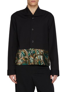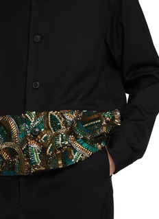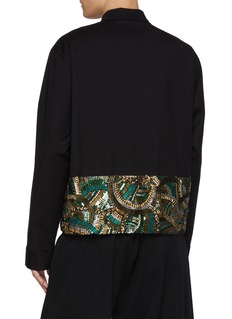 Dries Van Noten's artisanal mastery shines in this tailored jacket, where minimalist elegance meets opulent embellishment. The clean silhouette features a shawl collar and button closure, dramatically elevated by an intricately beaded and embroidered hem panel. A striking fusion of refined tailoring and luxurious craftsmanship.