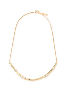 This elegant Dries Van Noten necklace is a masterpiece of understated luxury. Crafted in exquisite gold-tone metal, it features a sleek, curved bar centerpiece adorned with strategically placed crystals that catch the light with every movement. The slim chain enhances the necklace's delicate appeal, making it a versatile addition to both day and evening attire.