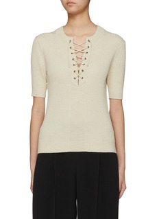 Dries Van Noten 将繁复主义操纵得出神入化,擅于将不同种类的花纹及材质融入单品,呈现出华丽而不浮夸的风格。这款针织衫采用系带领设计,不论内搭还是单穿,都能拥有层次细节魅力。