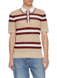 A modern interpretation of classic polo shirting, this short-sleeve design plays with texture and proportion through thick horizontal stripes and an airy mesh knit. From Dries Van Noten’s refined menswear language, it pairs effortlessly with denim or tailored trousers for polished daytime ease.