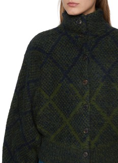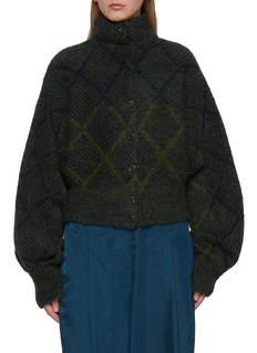 This Dries Van Noten cardigan reimagines heritage checks with bold scale and tactile richness. Knitted from a mohair-wool blend, its high buttoned collar and voluminous sleeves frame a cropped silhouette — a statement layer to contrast sleek trousers or flowing skirts.