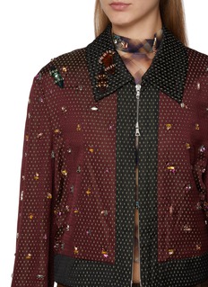 Dries Van Noten 以繁复印花、奢华面料和精致剪裁著称,融合东西方元素,展现浪漫与优雅并存的独特美学。这款夹克采用精美仿钻刺绣工艺,撞色拼接设计彰显品牌标志性的视觉冲击力,拉链开襟营造利落轮廓,短款版型修饰身形比例。