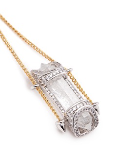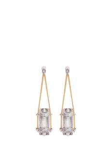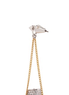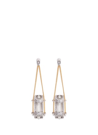 伊迪波哥的配饰糅合传统美式风格与朋克格调,是展示硬朗自信的理想选择。这款耳环的设计充满未来感,以两条镀金细链条连接镀银黄铜吊坠,中央镶嵌一颗锥形柱体晶石,造型独特,为您的个性形象带来点睛之效。