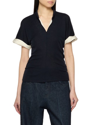 Sculpted with a clean split neckline and softly cuffed sleeves, this wool knit top balances precision with ease. Edition refines the silhouette through subtle contrast lining and a close, fluid fit, ideal for elevating denim or grounding tailored looks.