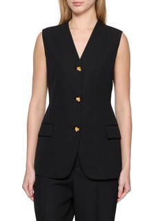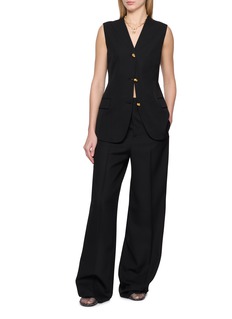 韩国品牌 EENK 由设计师 Lee Hyemee 创立,时尚内核皆糅合了其多元化设计背景,旨在为现代女性打造多变造型。这款马甲用玫瑰金扣打破黑色单品的沉闷,挺括材质强化版型感,V 领无袖兼顾清爽与干练。