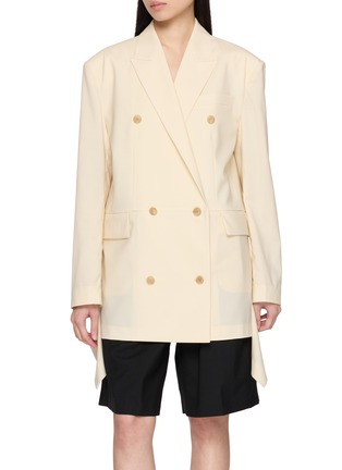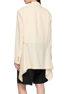 Precision tailoring meets fluid movement in this double-breasted jacket, defined by a softly draped back layer that falls into handkerchief hems. Structured shoulders and clean lines frame the silhouette, while EENK introduces quiet drama—wear it over shorts or sharp trousers for modern suiting.