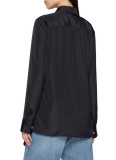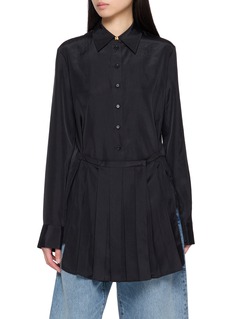 A study in fluid architecture, this EENK shirt reimagines classic tailoring through sculptural pleats and an integrated silk scarf that transforms with every tie. The elongated silhouette drapes with quiet drama—style it loose over denim or cinch the scarf to define the waist for evening.