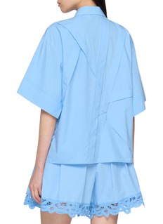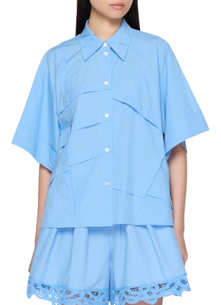 Architectural lines redefine this short sleeve shirt, where folded panels intersect across the body in sculptural precision. Crisp cotton enhances its clean structure, while the relaxed silhouette ensures ease. A modern essential from EENK, perfect with tailored shorts or fluid trousers.
