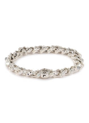 his Emanuele Bicocchi bracelet captures the essence of refined edginess with its luxurious sterling silver construction. The design features interlinked segments that exhibit a fluid, almost organic form, complemented by the unique texture that adds a tactile quality to the piece. A standout clasp, showcasing the brand's iconic compass motif, not only ensures security but also serves as an eye-catching element.