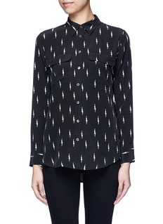 Equipment的衬衫款式多变,此系列联乘英国名模Kate Moss,通过印花与撞色带来变奏。这款以黑白拼色设计,借通身的白色闪电印花向英国摇滚音乐家David Bowie致敬,让您的时尚造型增添不羁个性。