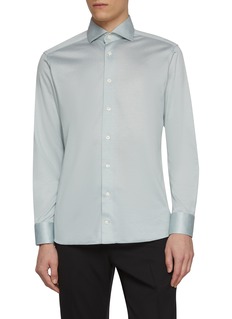 Woven with the luminous finesse of Filo di Scozia cotton, this jersey shirt redefines modern polish through a subtly lustrous finish and fluid drape. Its elevated comfort allows it to shift effortlessly from boardroom formality to evening ease—perfect for refined layering or worn solo for a crisp, contemporary statement.
