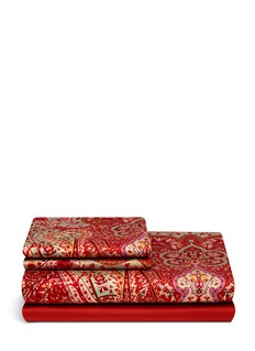 Etro擅长以复杂细腻的佩斯利花纹打造优雅浪漫的家居单品。这组床品共包括一个被套、一条床单及一对枕套,红色主调棉缎轻柔顺滑,配以标志性的佩斯利印花,洋溢精致复古风情,为卧室增添摩登贵族气派。