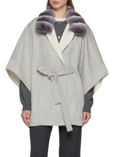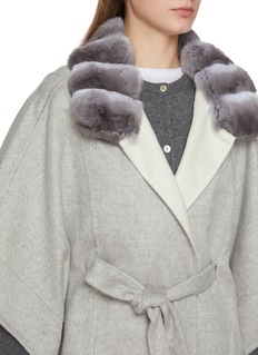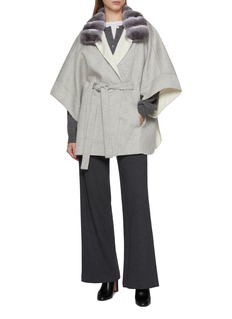 Fabio Gavazzi lends a sculptural softness to outerwear with this cashmere cape, framed by a chinchilla fur collar that ripples in silvery gradients. The fluid silhouette drapes elegantly, cinched by a matching belt — a statement of quiet glamour for day-to-evening layering.