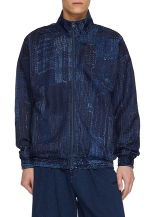 FDMTL's statement track jacket features all-over patchwork construction with intricate sashiko stitching in varying weave patterns. The relaxed bomber silhouette showcases ribbed trims and full-zip closure for modern athletic style. A bold fusion of traditional Japanese textile craft and contemporary streetwear design.
