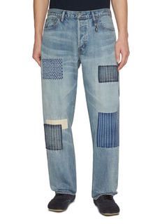 FDMTL's straight-leg jeans showcase authentic boro patchwork with hand-applied sashiko repairs featuring varied grid and stripe patterns. The vintage-inspired silhouette balances multiple patches—from dense crosshatch to vertical running stitches—each celebrating Japanese textile preservation. Collectible denim that honors centuries-old mending traditions.