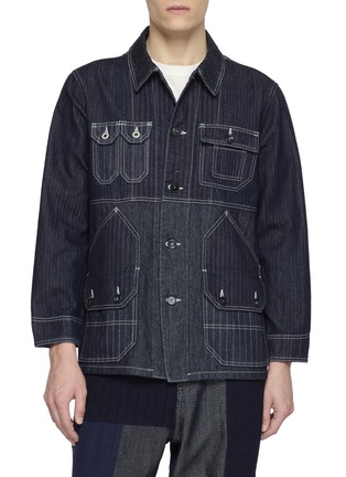 Vintage craftsmanship meets modern utility in this FDMTL patchwork jacket, where denim panels and functional pockets create a bold, textured silhouette.