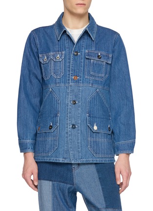 Vintage craftsmanship meets modern utility in this FDMTL patchwork jacket, where denim panels and functional pockets create a bold, textured silhouette.